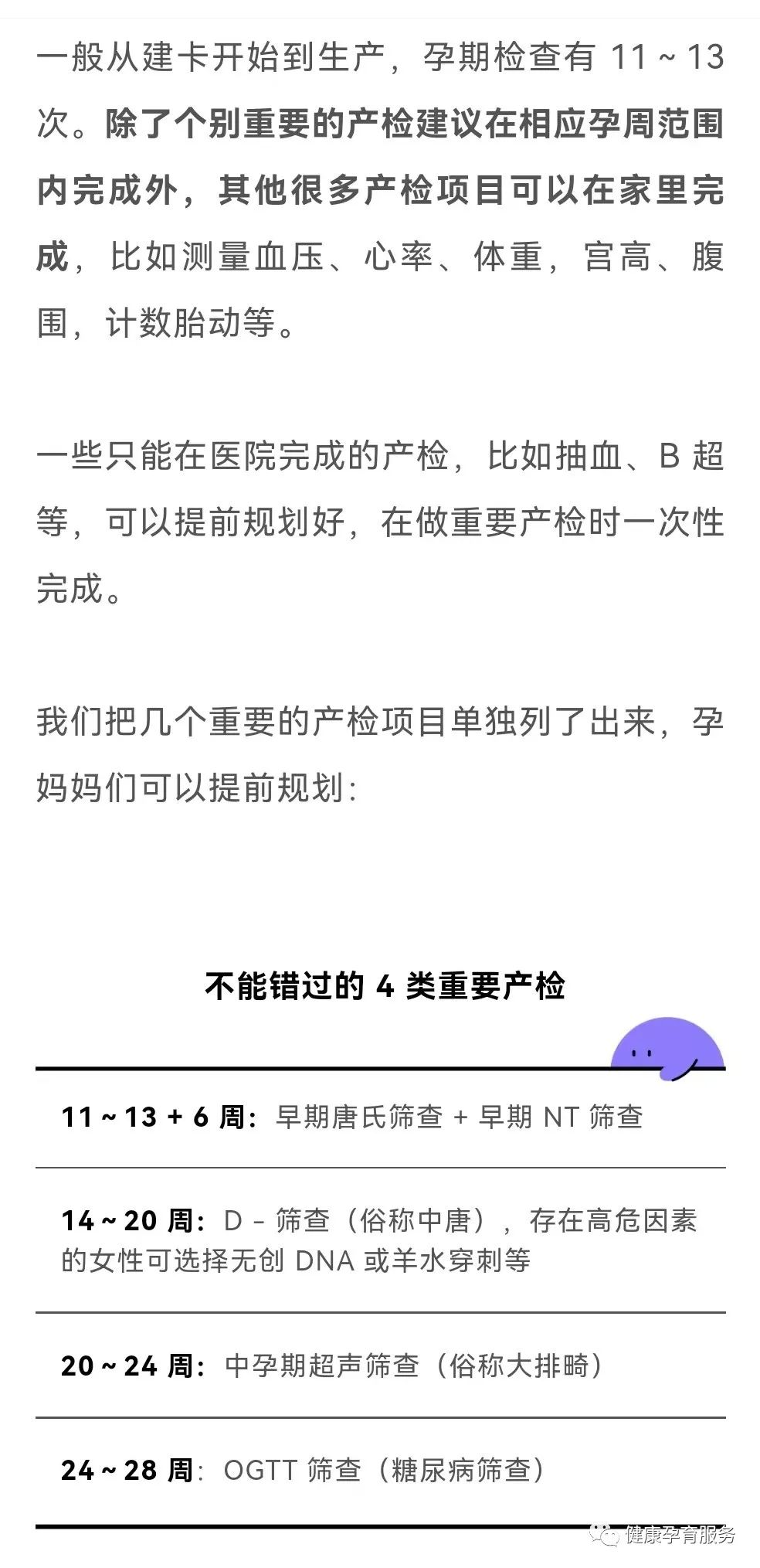 对于不同孕期的检查能否跳过和延后,我们也做了详细的介绍,妈妈们可以对比着看: